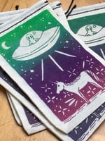 All prints vary in color because they were printed by hand using the split fountain technique of screenprinting, a method involving adding colors throughout the process to get various gradations.