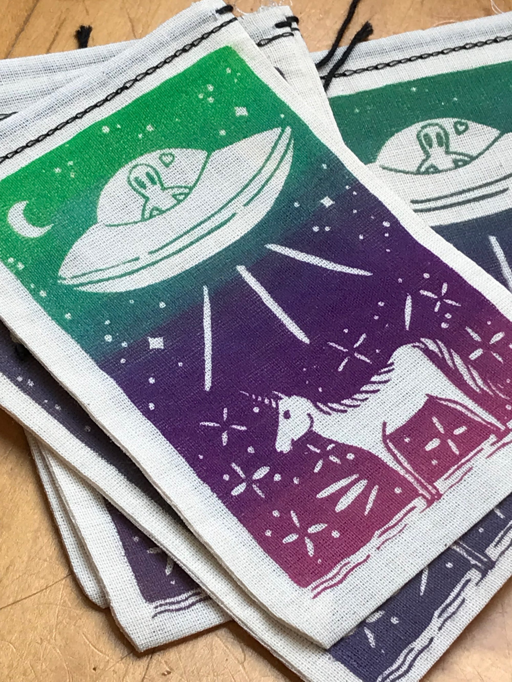 Screenprint using water based inks on 100% Cotton Drawstring Bags.