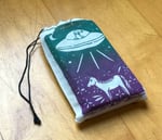 During a starry moonlit night, an alien flying in a saucer-like aircraft beams up a magical unicorn, that it loves.