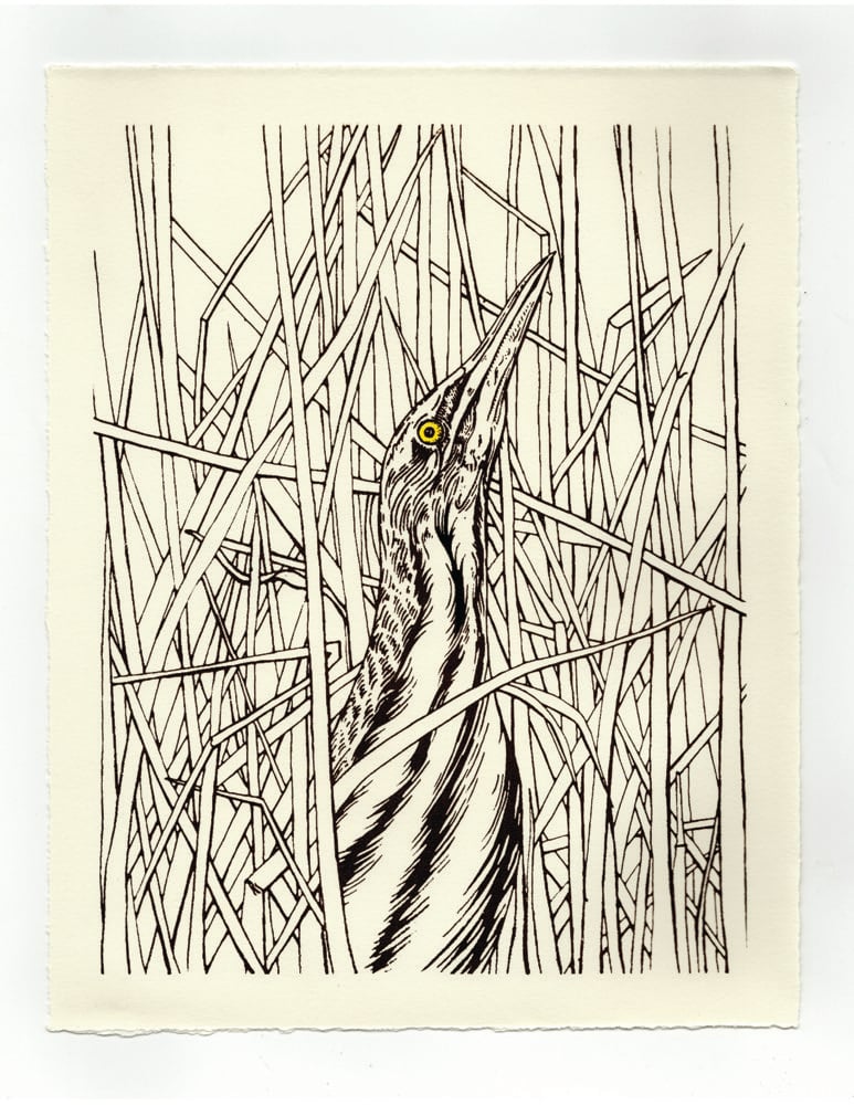 I’ve depicted the American Bittern in one of its most notorious stances, frozen with head pointed skyward when perceiving a threat. Sometimes this bird will even sway with the reeds to camouflage itself further. This bird’s survival is threatened because of population decline from habitat loss. I was initially interested in this bird because 1. I’ve never seen one and 2. They live in one of my favorite places to explore: marshlands, bogs, and waters’ edges. In Vermont, primarily white settlers have a long history of moving and dredging rivers as well as a recent past of reciprocity with nature through stewardship and conservation. When we move rivers, we cut off other essential waterways like inland marshes that support small wetland creatures like frogs, turtles, snakes, and even spawning pike that feed our feathered friends. “Riparian restoration” projects as well as larger conversations about floodplains, climate change, and conservation are becoming more popular and give me hope that we can rewild and restore some of the wetlands that are needed for birds like this to thrive.
