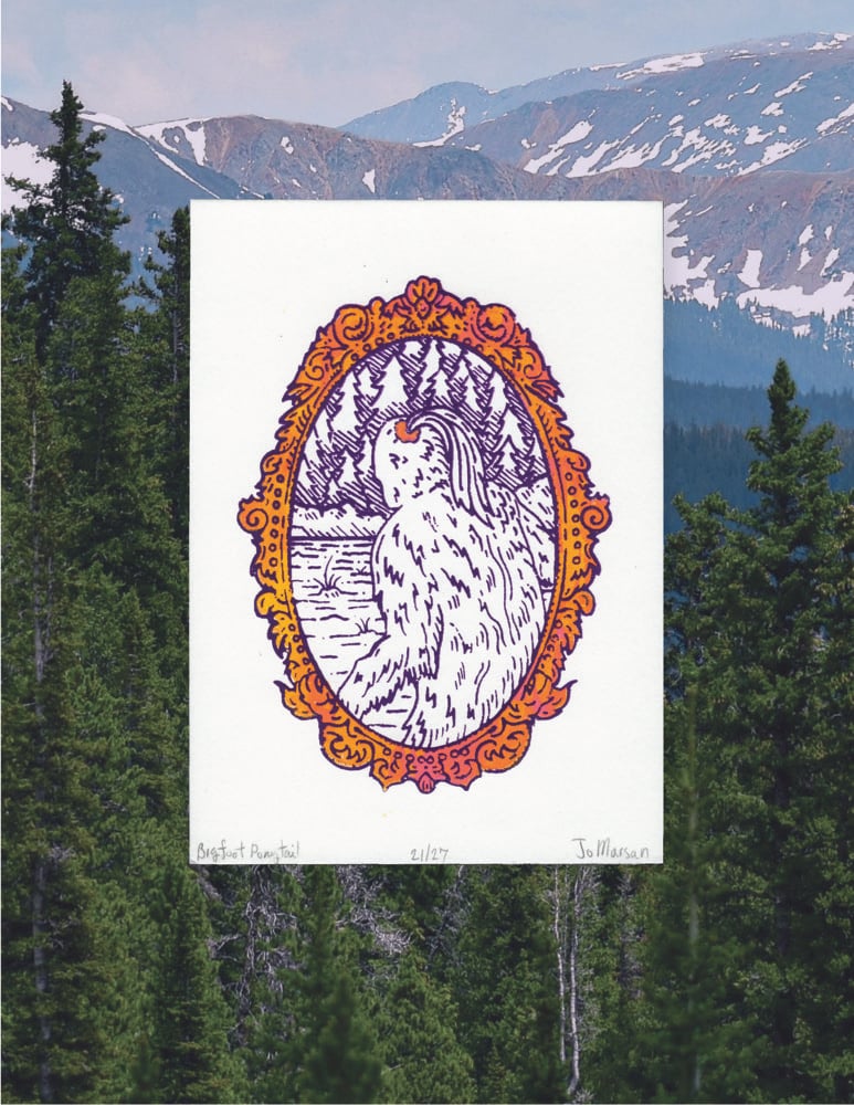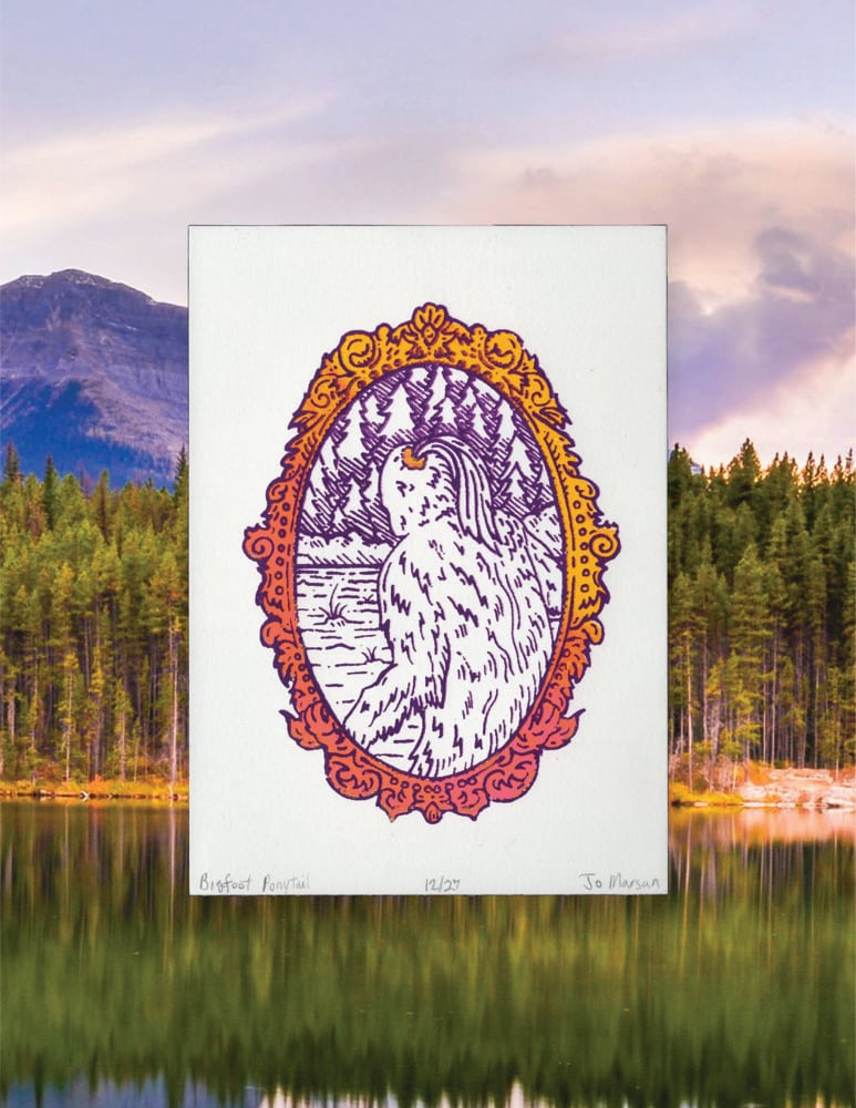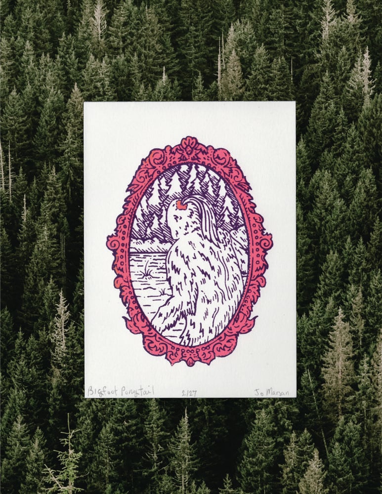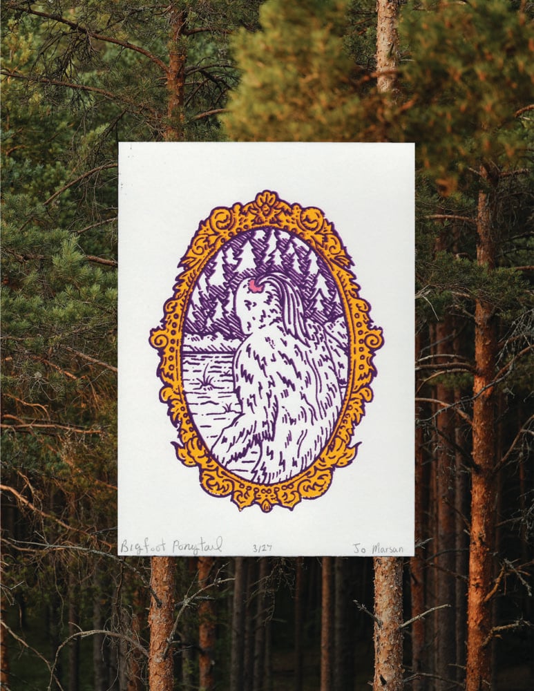 Bigfoot, with a ponytail sustained by a scrunchie, is leaving the scene amongst the backdrop of a coniferous forest surrounded by a golden filigree frame.