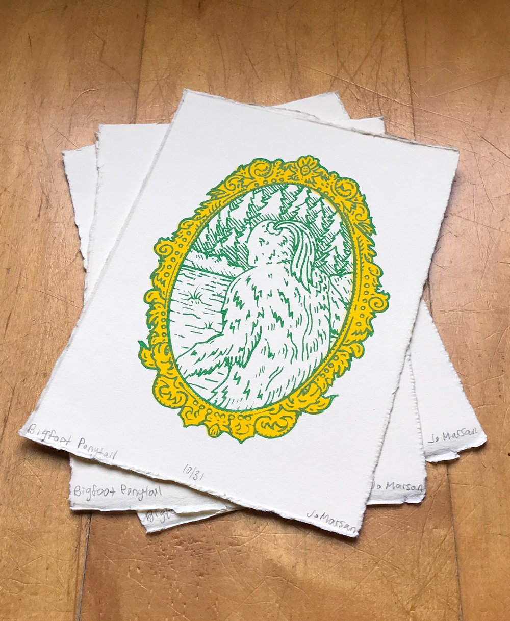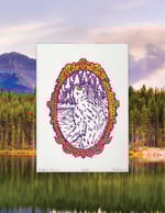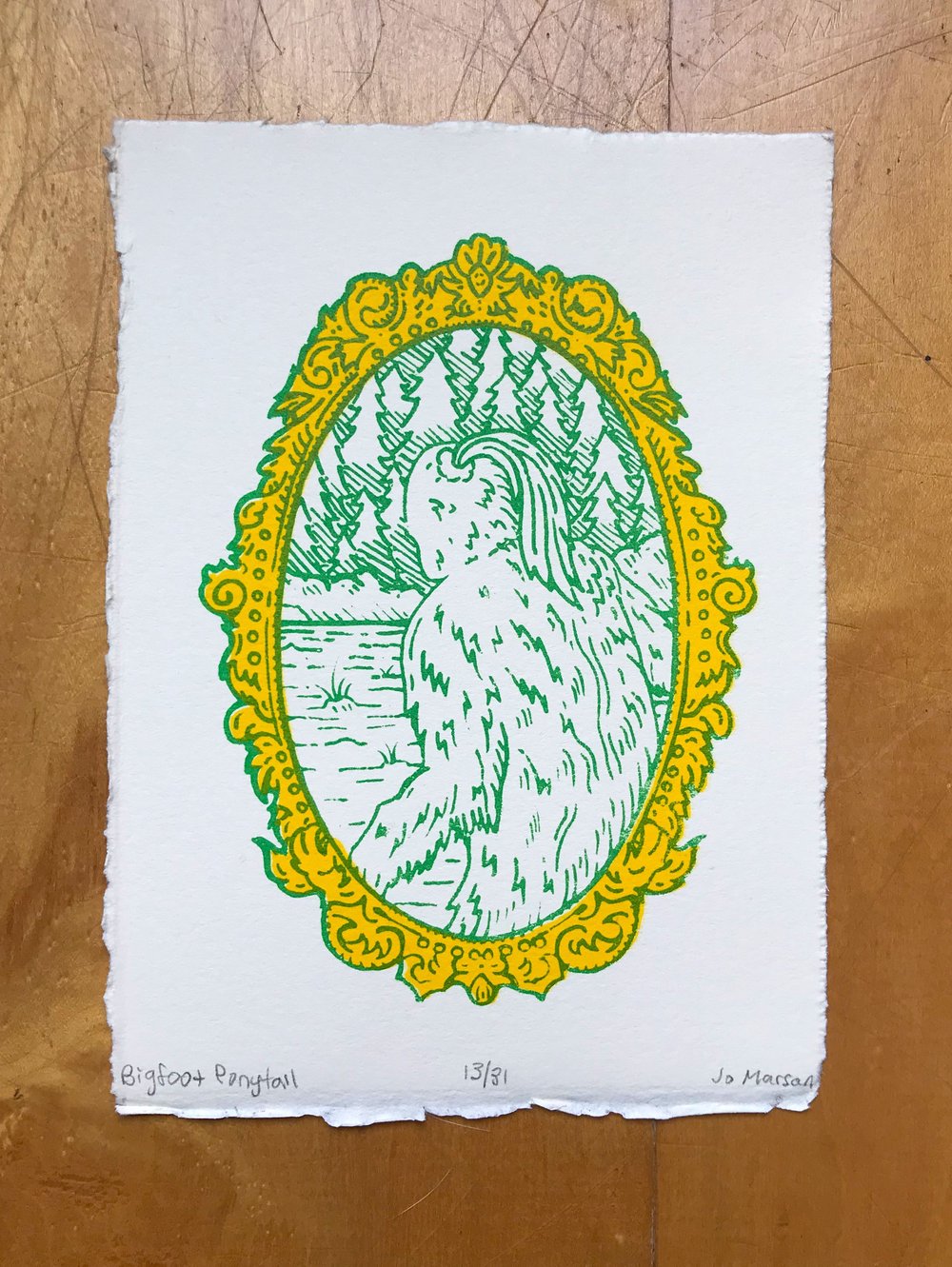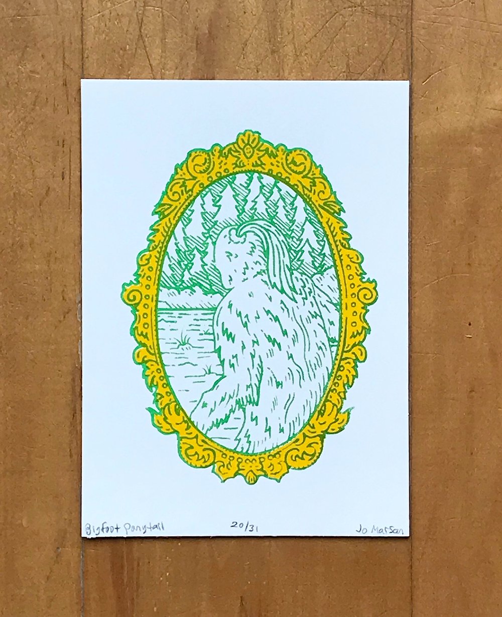 Bigfoot, with a ponytail sustained by a scrunchie, is leaving the scene amongst the backdrop of a coniferous forest surrounded by a golden filigree frame.