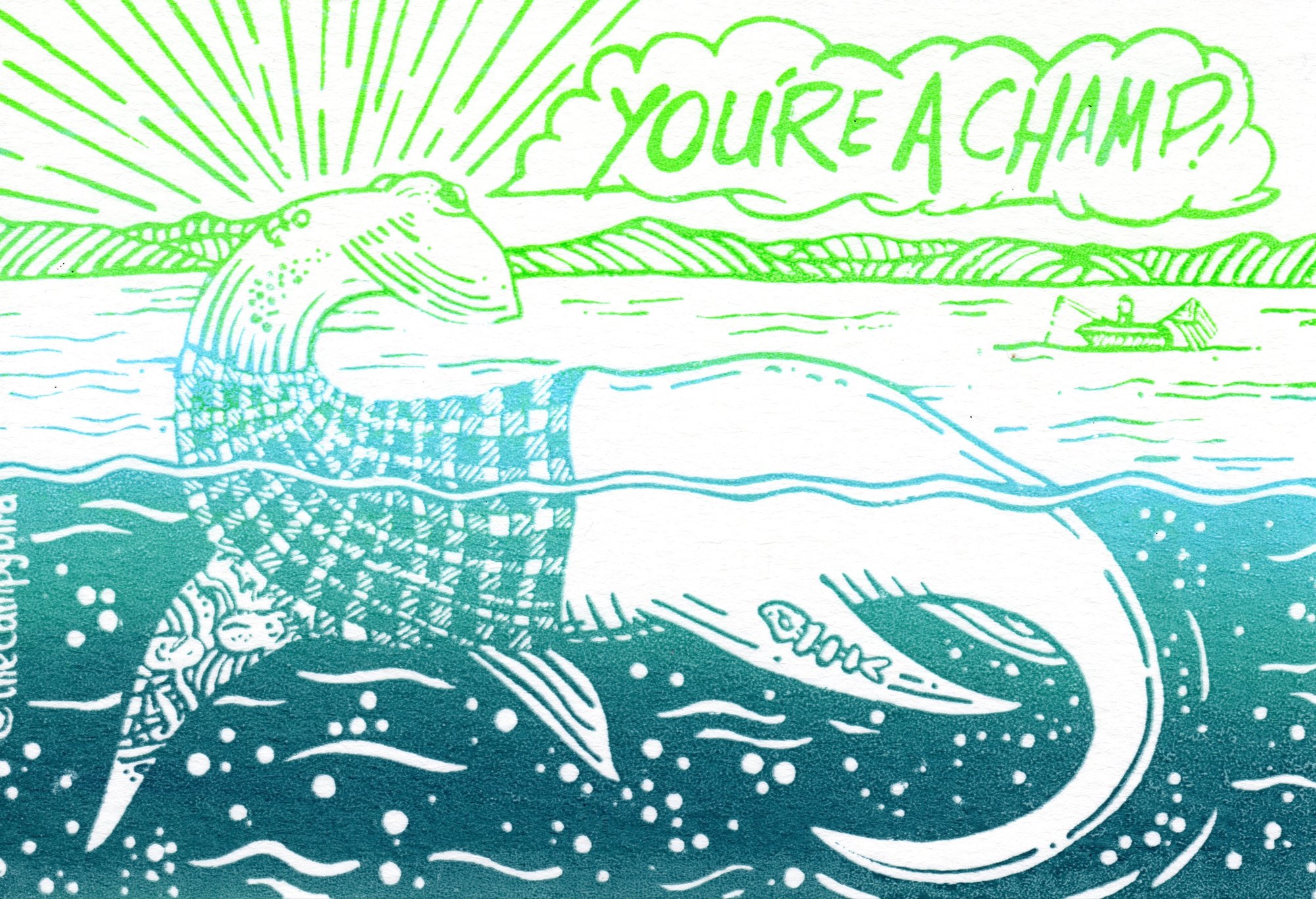 Champ is the mysterious lake cryptid of Lake Champlain between New York and Vermont. I’ve recreated Champ here complete with a flannel, and tatted flippers. This is a split fountain, one layer screenprint in various arrays of blues and greens on Strathmore postcards as well as in black water based ink.