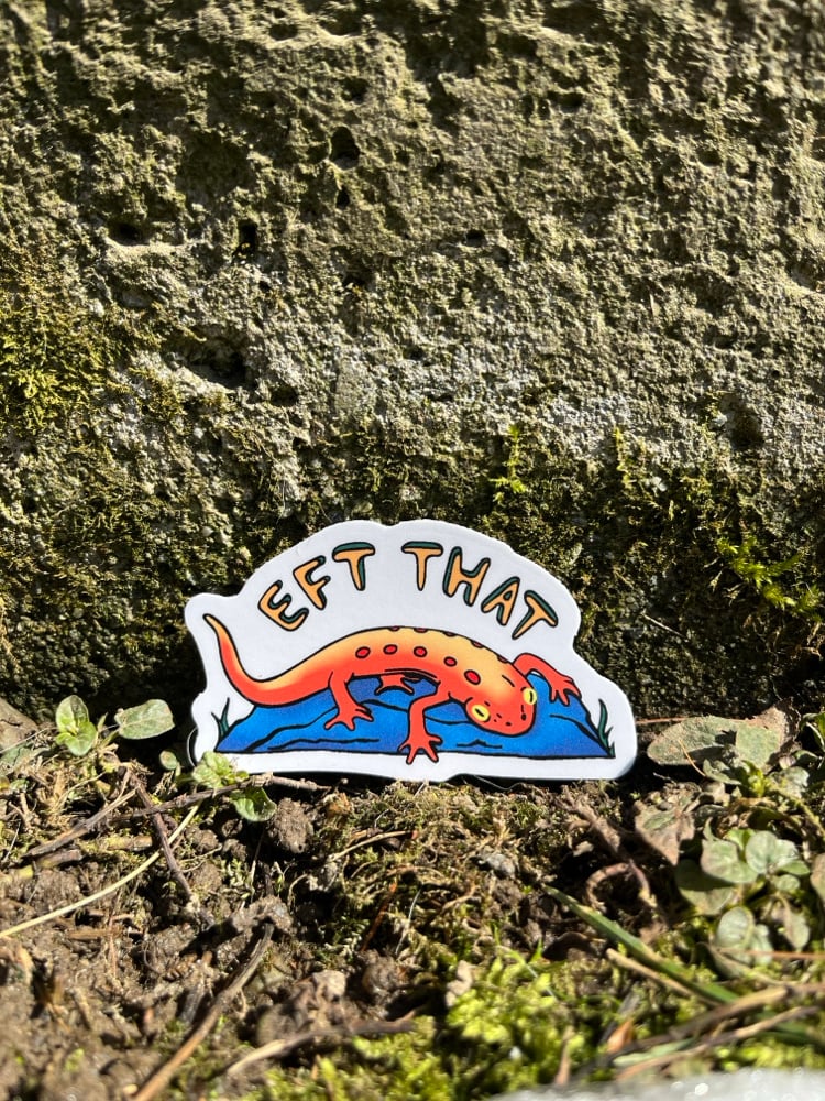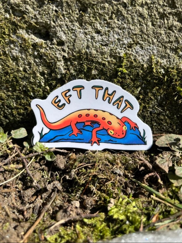 The EFT THAT sticker is a play on words that means F*** that! in a way that says “No thank you. Definitely no.” It showcases a small orange salamander in its “eft” stage of life sitting on a rock with text above it that reads EFT THAT. The newt is in its middle stage from juvenile to adulthood where it might roam around the forest floor from late summer to autumn.