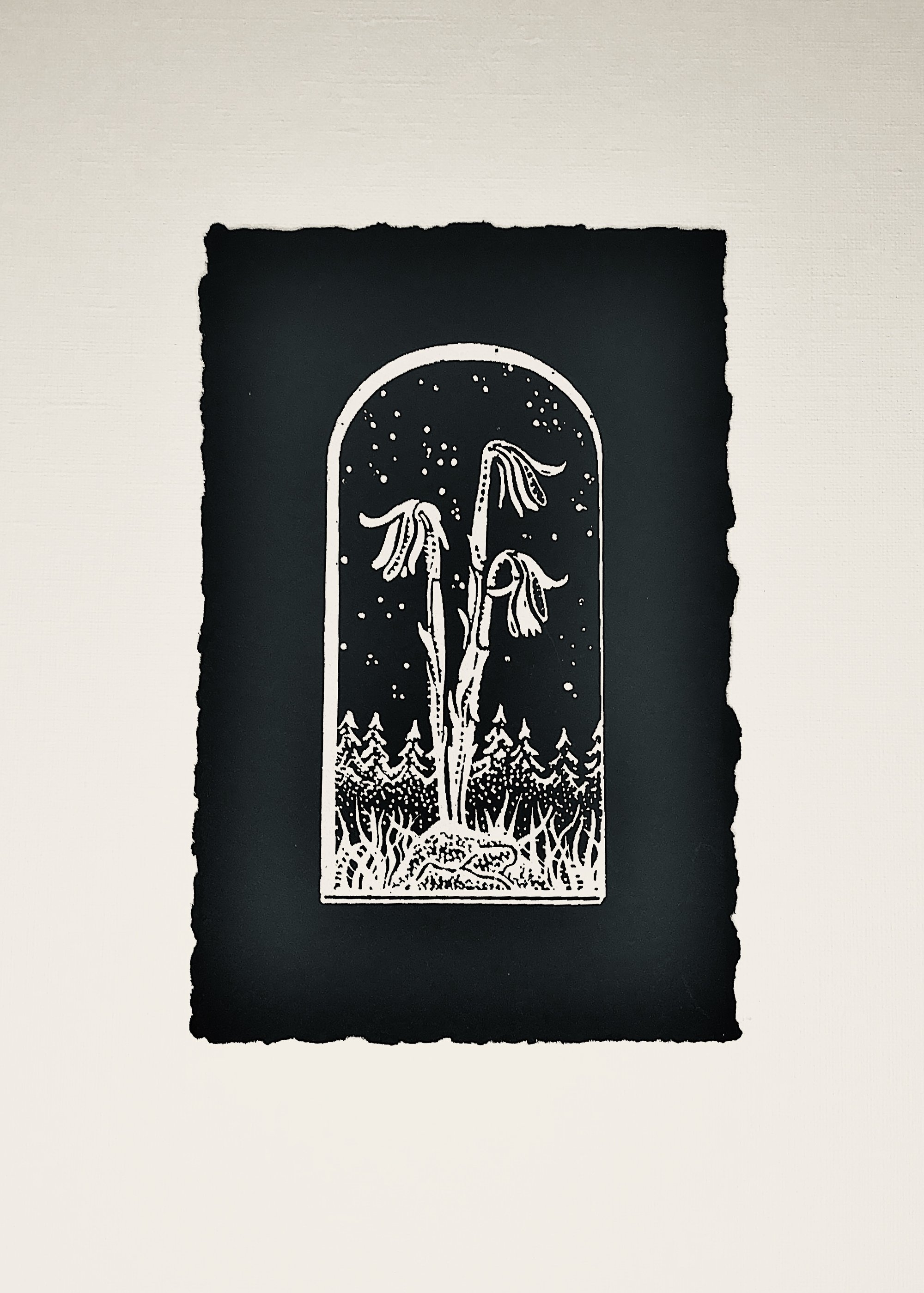 Ghost Pipes were printed by hand with white, water based ink as a single layer screenprint.