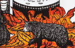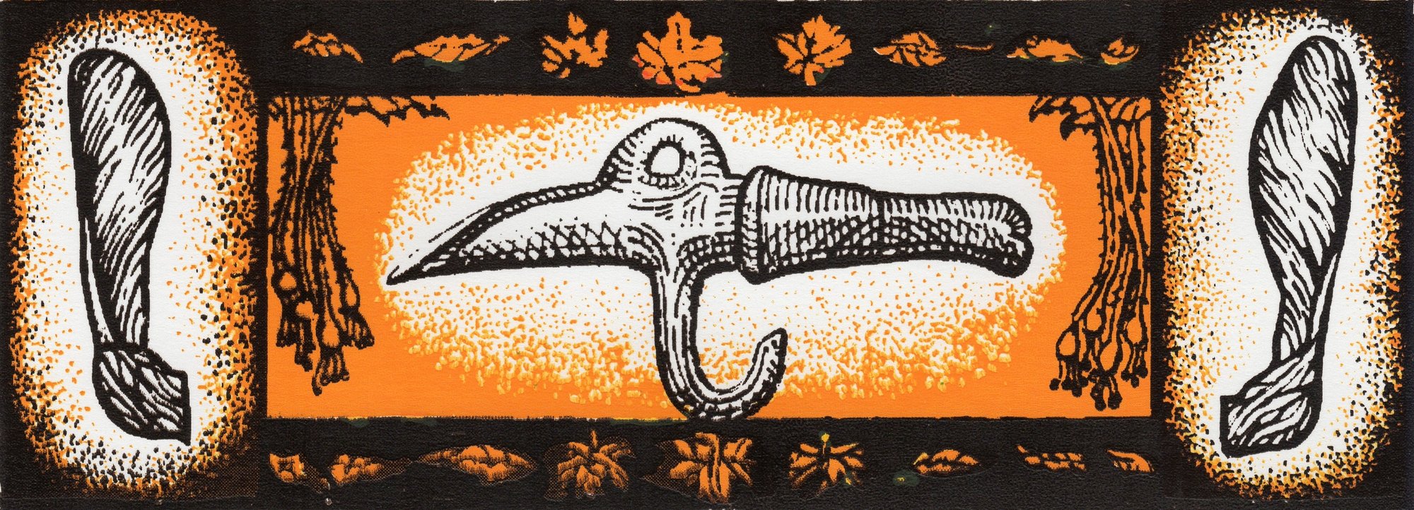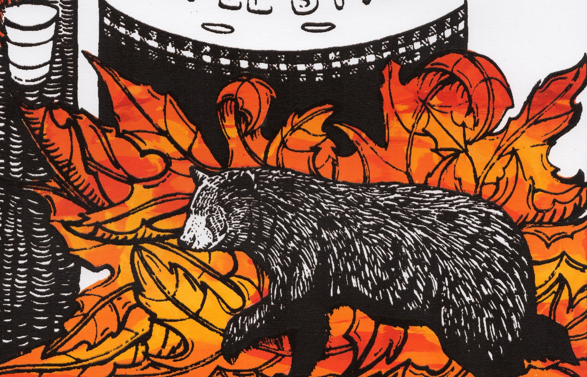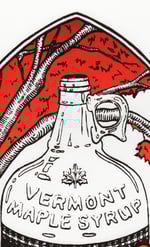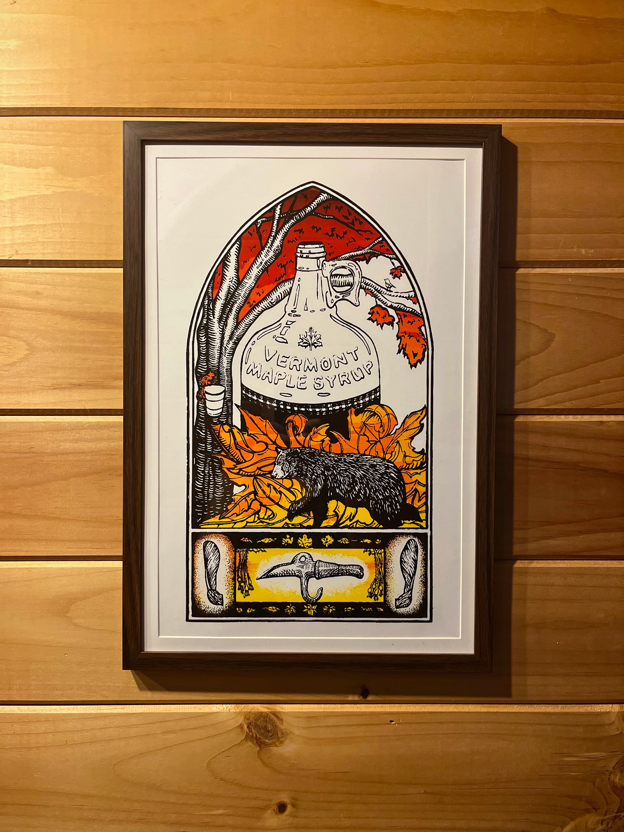 The Vermont Sugar Maple is a staple of Vermont agriculture. In the fall, “leaf peepers” travel from around the world to see these trees change color from bright yellow to deep red. This design is in the shape of a Lancet window taken from gothic architecture, and symbolizes the worship and idolization of the beloved sugar maple tree which produces some of the best maple syrup in the world. I’ve included motifs depicting the lifecycle of the tree with “helicopters” holding the seed of the plant, the small flowers it produces in spring that surround an old maple syrup tap, a giant, glass maple syrup jug, a sap bucket, and a black bear, red squirrel and hermit thrush, the Vermont state bird. These elements combined with oversized colorful leaves create a sense of place and reverence.