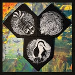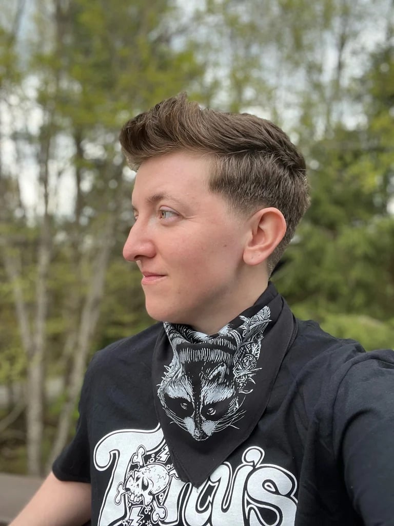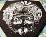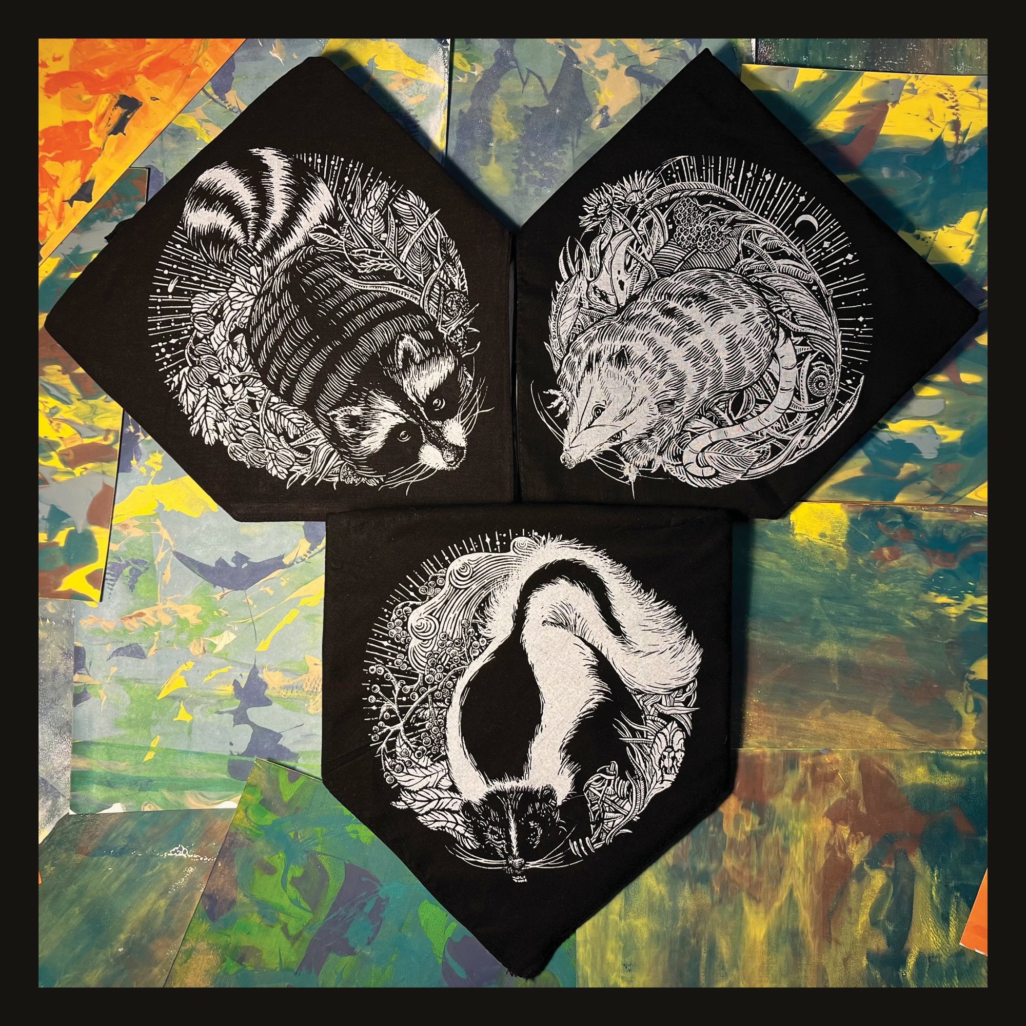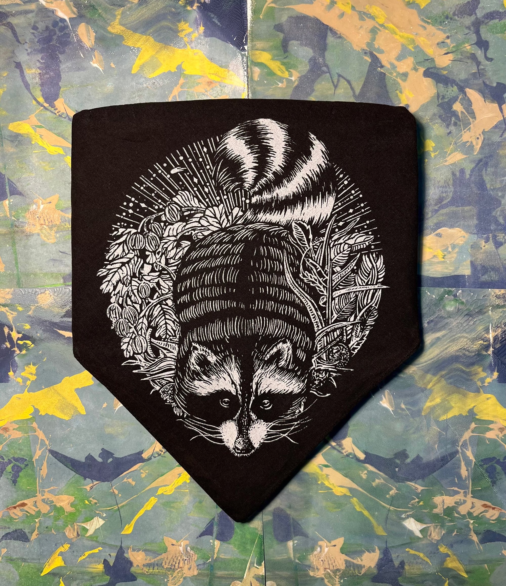 Raccoon & Gooseberries featured on a solid black, 100% cotton bandana printed with white water-based ink. Description: A raccoon stares up after having eaten through some bird eggs. It is surrounded by a gooseberry bush, another midnight snack. It rummages under the night sky with a mysterious comet overhead.