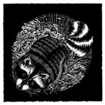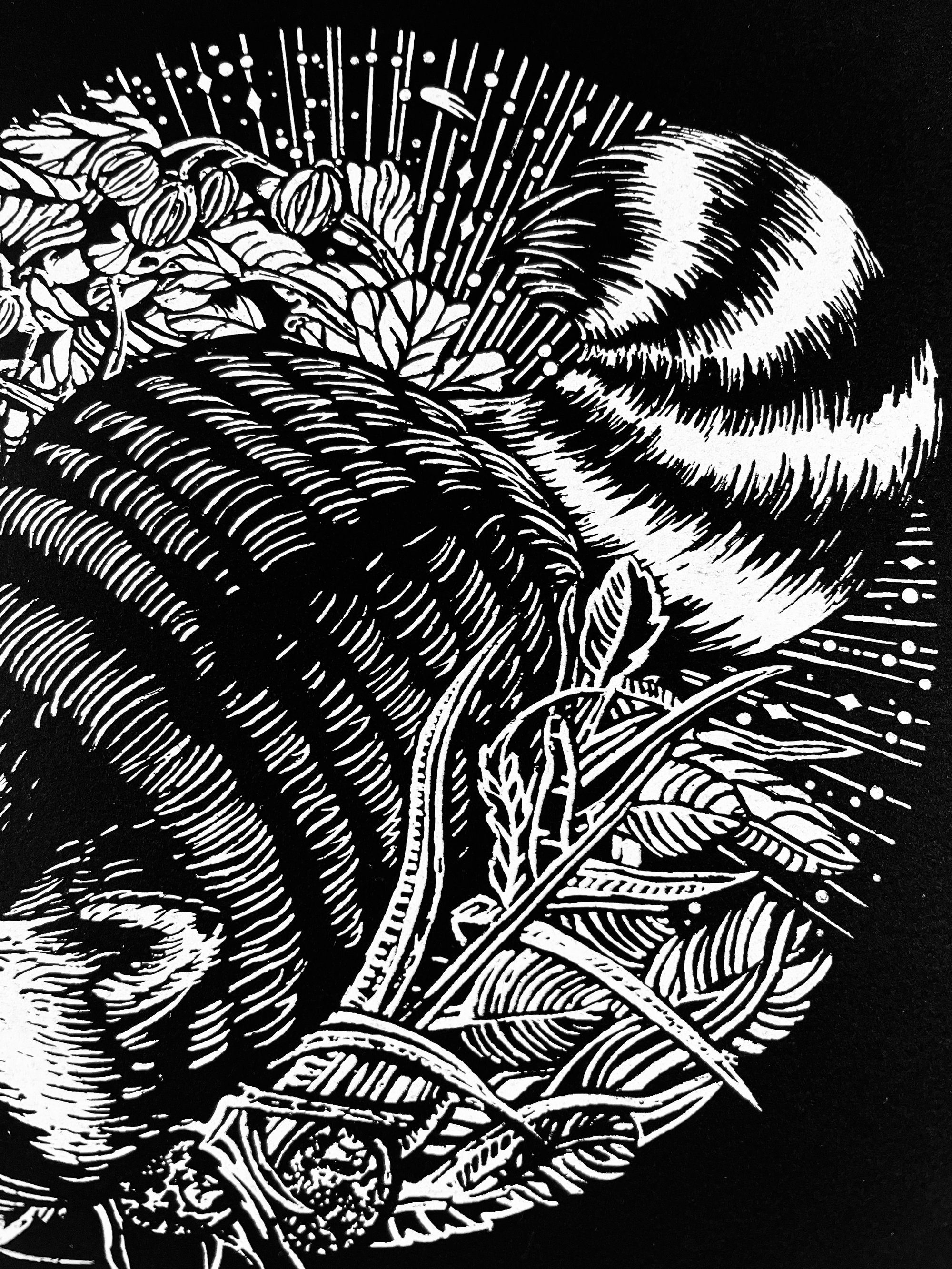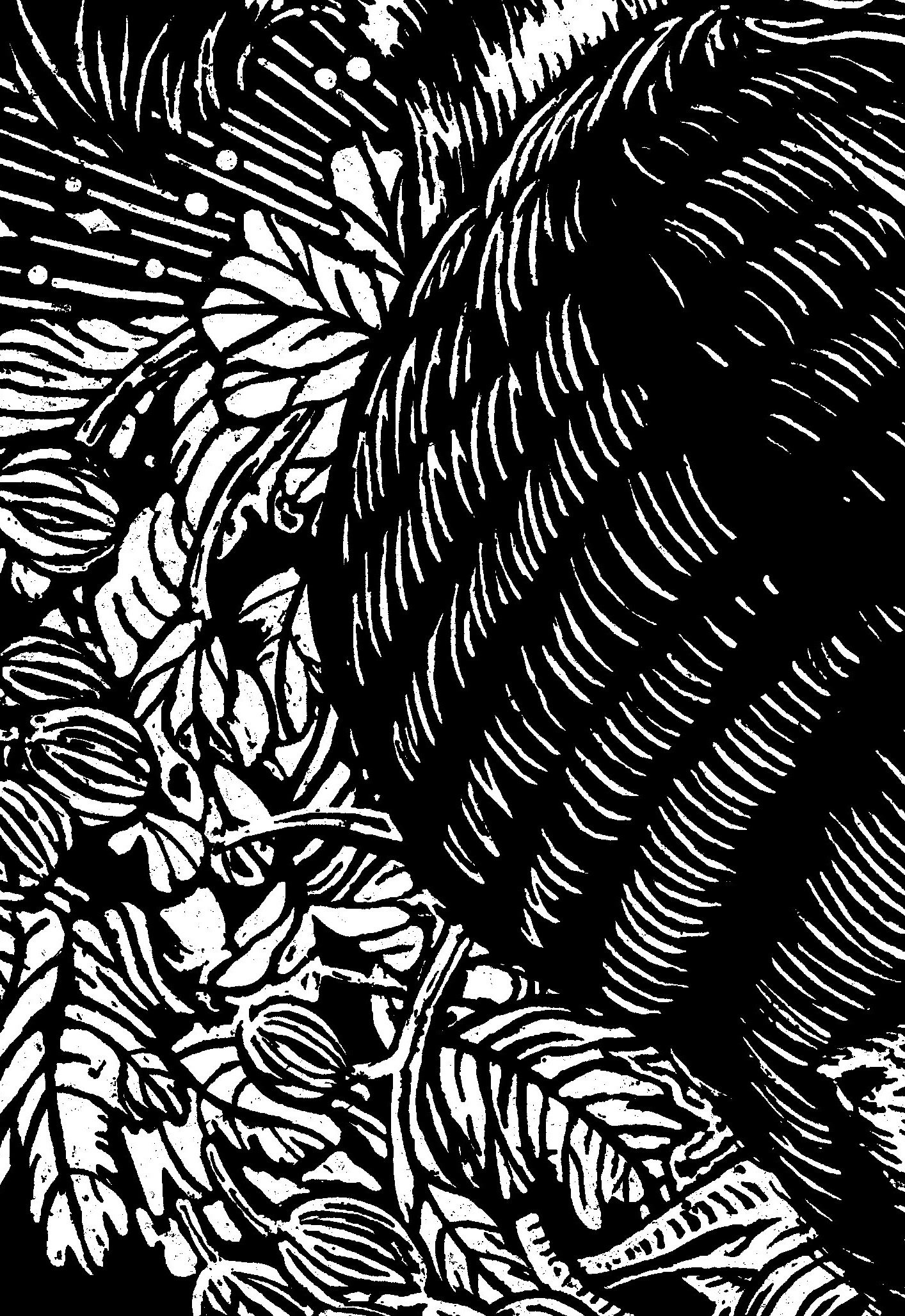 A raccoon stares up after having eaten through some bird eggs. It is surrounded by a gooseberry bush, another midnight snack, under the night sky with a mysterious comet overhead.