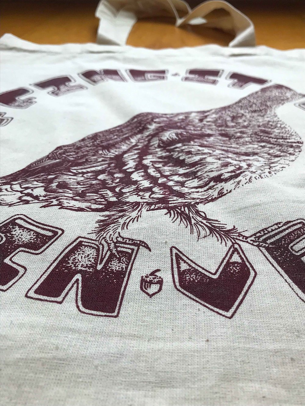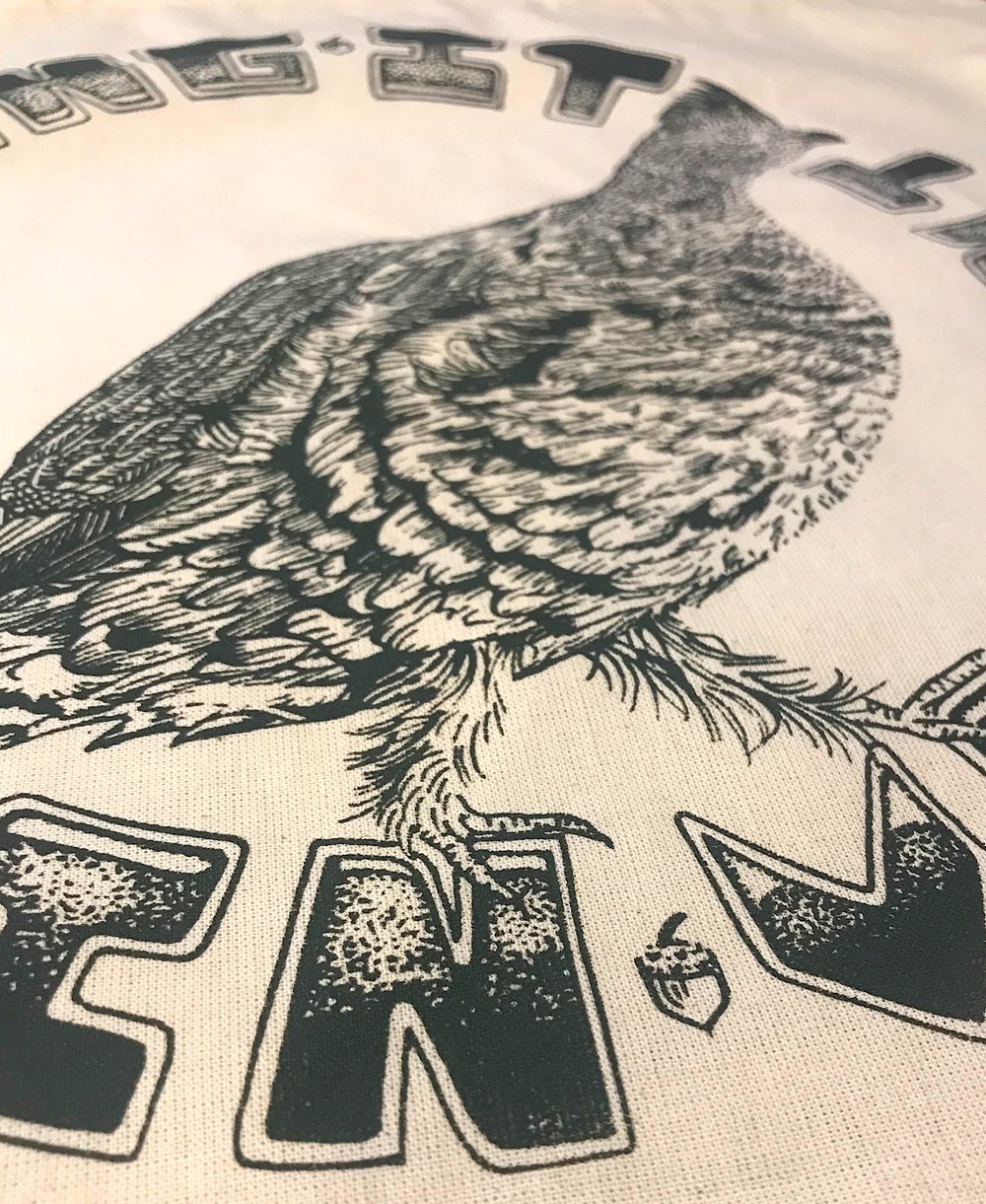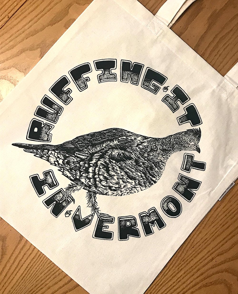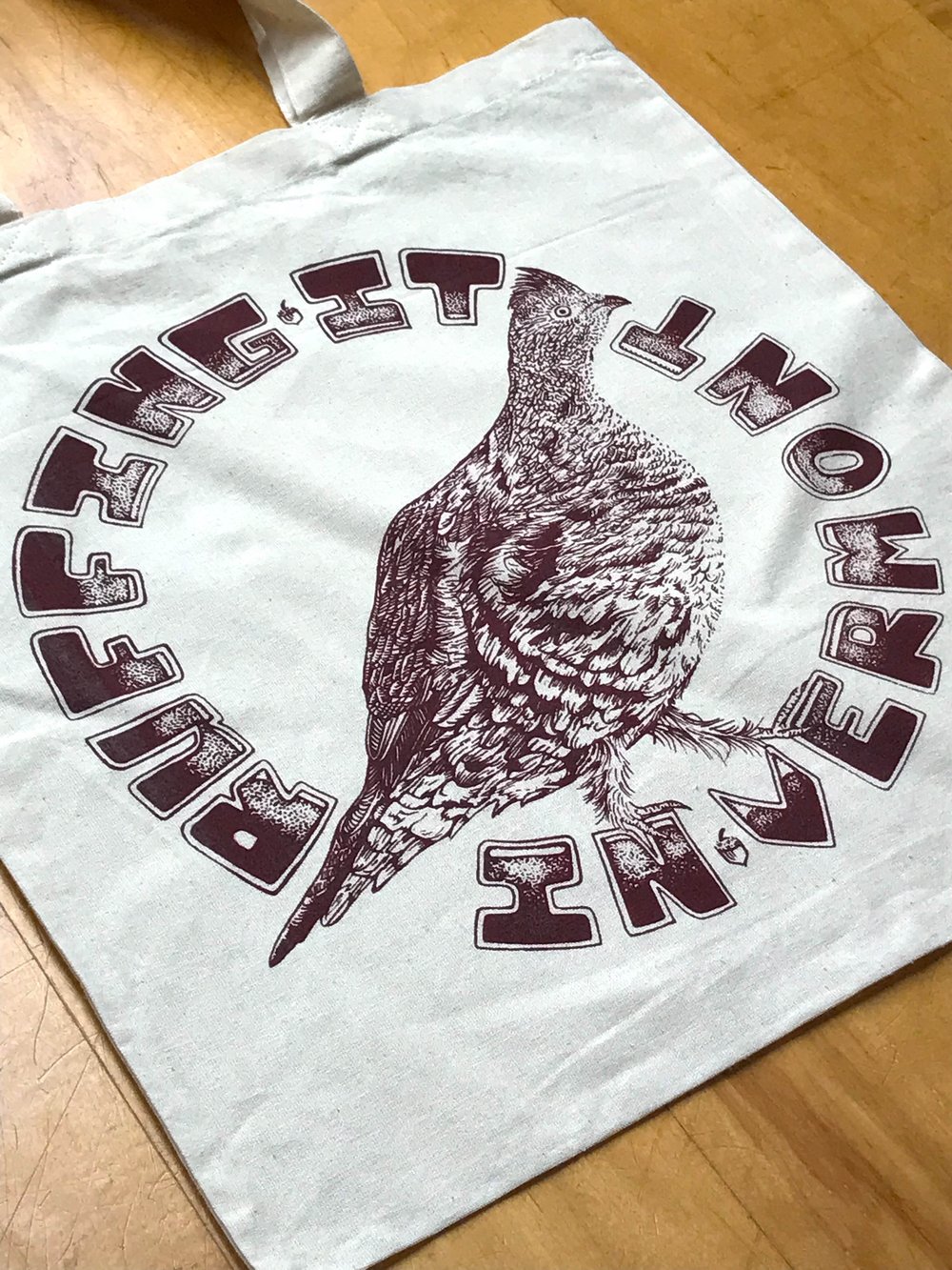 A ruffed grouse is framed by the hand-drawn phrase "RUFFING IT IN VERMONT"